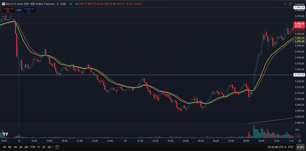 After the spike ended at 9:10, price entered a bull channel, generally riding the EMA from ETH chart as well as the RTH chart. There was another push around 12pm for price to almost hit 5990 but we didn’t quite get 6000 on either the futures or SPX index chart. We did however overshoot Friday’s high at around 5977.