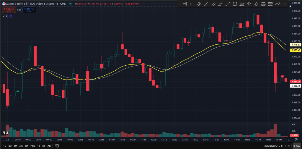 This bullish drift ended near the end of cash session, as price failed to breakout higher to test 5900 (came just 5 points shy at 5895) after riding the rising EMA. Note this peak happened at 14:30 and the 2-bar reversal formed a failed breakout for the bulls, causing bulls to exit and bears to be emboldened.