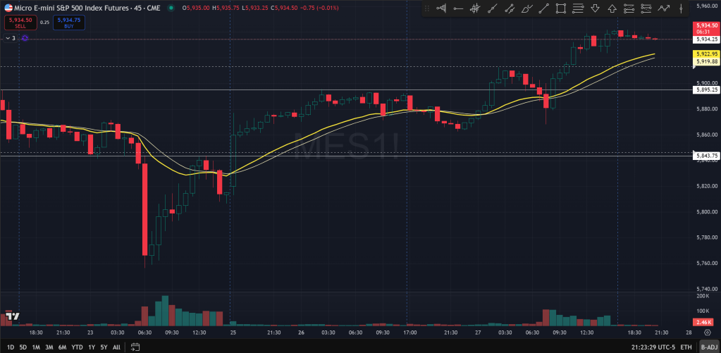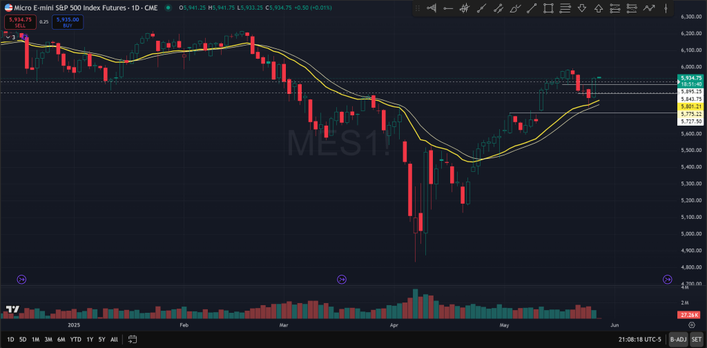 Currently, there is not a clear bear case until today’s bull trend bar gets fully reversed, and ideally with price under EMA. Price could test higher to 6000 but fail to continue higher and potentially forming a double top, but we will see that when it happens. Essentially, I see price at least visiting 6000 SPX/ES level in the short term likely this week and we will reevaluate next steps once that happens or not.