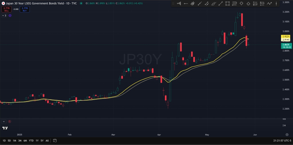 Global debt markets rallied on this signal with JP 30 year yield dropping 12bps and at a low 20bps. US long end yields also dropped, though not as dramatic, down about 7 or 8bps.