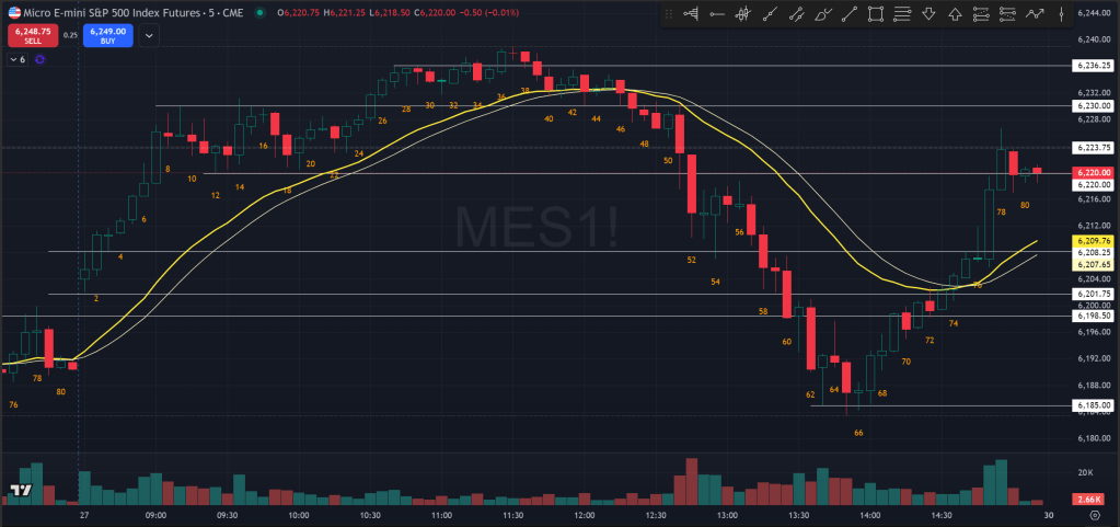 My bias will be higher until price fails to make another higher high or higher low, and will be more cautious if price somehow closes below the prior ATH level, currently at around 6150 for the SPX.