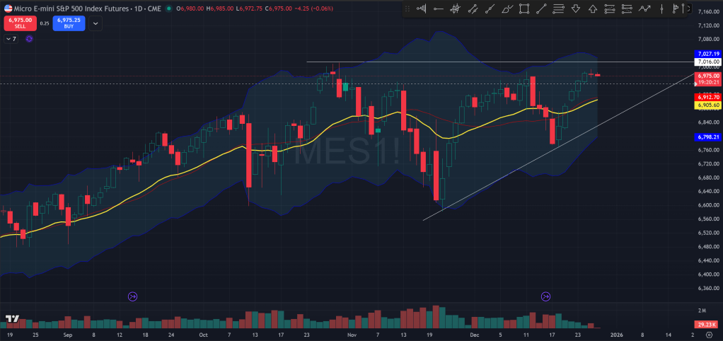 Looking at the new year, my base case would be for price to be able to resolve higher. This is due to the fact that we have been in a bull trend, and the Fed is on a loosening quest, while at the same time the AI spending is still going on and could be seeing some more utilization and boost to productivity in the new year. The labor market could be weakening, as the no-fire-no-hire continues on, but I find it hard to imagine that the president would allow any real weakening in the labor market and the economy to happen in the year 2026, so the Fed would be ready to step in with force with any concrete sign of weakness.