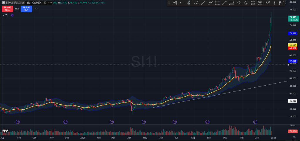 Take a look at Silver futures. It has gone nearly vertical over the past week. I won’t be surprised at all if price sees some moderate pullback from here especially in the new year.
